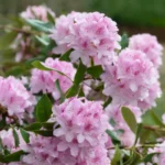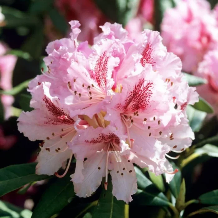 Вечнозеленый крупноцветковый гибридный кустарник с плотной широкой кроной. Растет кустарник до 1,5-2 м в высоту, в ширину достигает 1,7 м. Верхушки побегов покрываются броскими розовыми соцветиями, каждое из которых включает по 10-15 цветков с диаметром около 6,5 см. Цветки розовые с темно-красным рисунком на верхнем лепестке. Цветение с середины мая до начала июня. Возможно повторное цветение осенью!