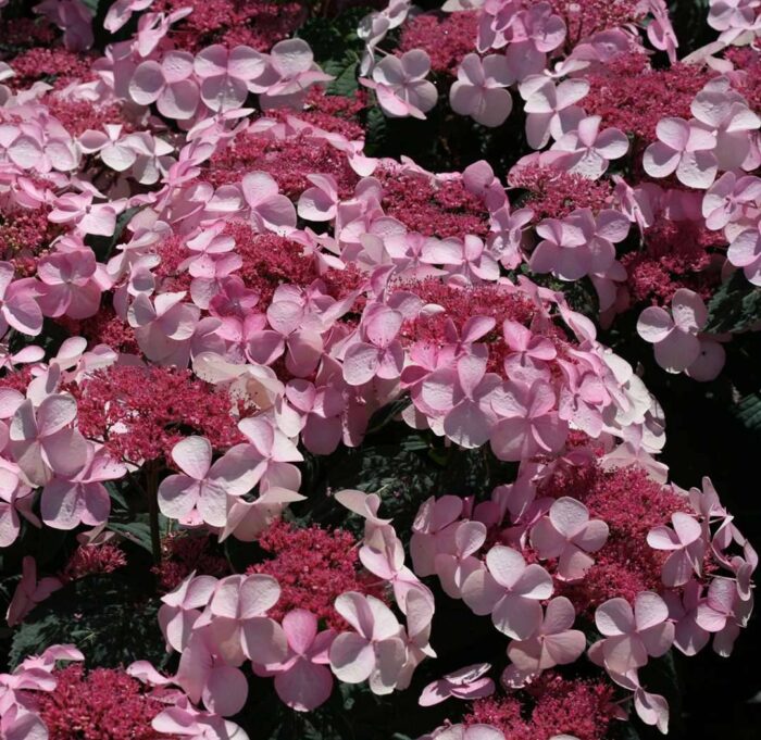 Гортензия пильчатая Daredevil — компактный кустарник округлой формы, который вырастает в высоту до 50-60 см и почти до 100 см в ширину. В середине лета появляются щитковидные соцветия, у основания которых концентрируется множество фертильных розово-белых цветочков, а по краю располагаются уже гораздо более крупные цветки с отчетливо различимыми лепестками с ажурными краями. Лепестки имеют ярко-розовую окраску на щелочных грунтах и темно-пурпурную окраску на кислой почве. Ближе к осени цветки становятся темно-красными, засыхают и держатся, сохраняя свой цвет, всю зиму. Темно-зеленые листья в конце лета также меняют цвет до пурпурно-шоколадного.
