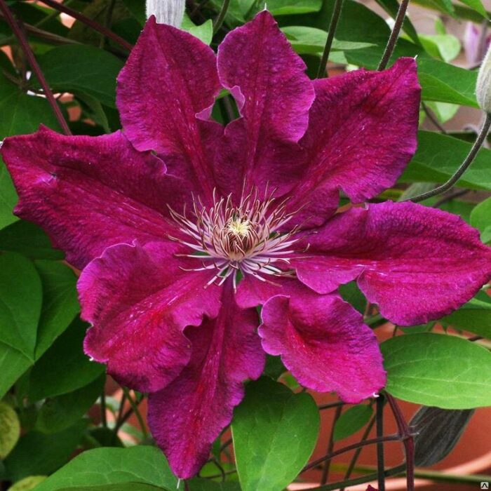 Сорт отличается поздним, но довольно длительным и обильным цветением. Он может достигать в высоту 4 м и и до 1,5 м в ширину, легко вьется по сеткам, оградам и даже стволам небольших деревьев. Ветви толщиной 2–3 мм, сверху ребристые, опушенные, коричнево–серого цвета, гибкие, сильно ветвистые. Цветет исключительно на побегах текущего года. Цветки из 5–6 бархатистых лепестков, около 15 см в диаметре, слегка бархатистые, с кремово-коричневыми тычинками. Лепестки заостренные, продолговатые, с волнистым краем, могут быть красно–лилового, красно–бордового или яркого–красного цвета. Цветет растение с июня до начала октября. Ernest Markham отлично растет на ярком солнце, ее цветки не склонны выгорать под прямыми солнечными лучами.