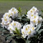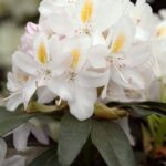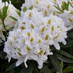 Рододендрон Мадам Массон — вечнозеленый кустарник высотой 2,5 м, шириной до 3 м. Крона прямая, густая, округлая. Весь куст утопает в цветочных россыпях из белоснежных плоских звезд с золочением на верхнем кончике. Листья темно-зеленые, эллиптические, кожистые, блестящие, длиной 10-15 см, 2-4 см шириной. Цветы почти что плоские, белые с большим желтым глазком, собраны в длинные конические соцветия без аромата. Цветение в мае – июне.