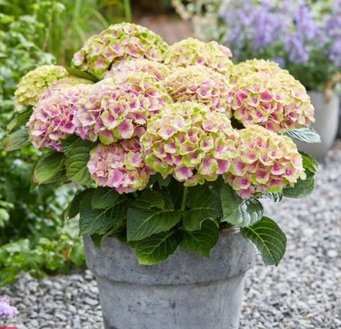 Гортензия крупнолистная «Magical Jewel» — это растение, которое станет настоящим украшением любого сада или цветника. Открывается цветками лаймового цвета и становится розовым или голубым от центра цветка. По окончании сезона цветки полностью синеют. Благодаря компактному росту эта гортензия прекрасно подойдет для горшка на патио или террасе. Цветение обильное, продолжительное. Листья овальные, темно-зелёные.