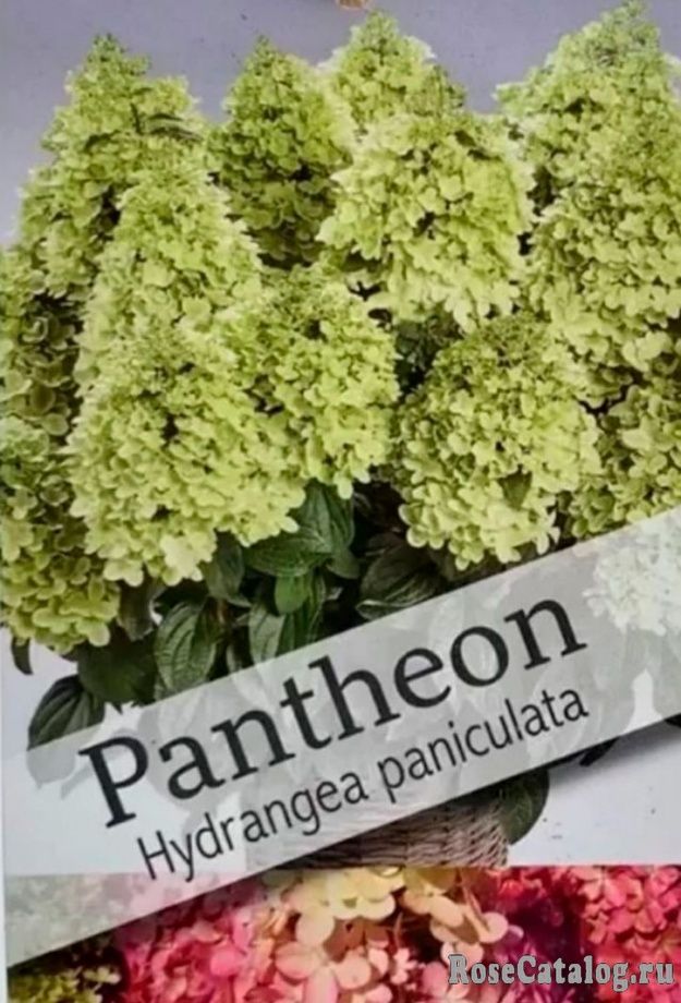 Гортензия метельчатая «Пантеон» (Pantheon) — самая тёмная гортензия из всей серии PAN. Пантеон имеет широкие конические соцветия, крупные, плотные; стерильные цветки диаметром 2-3 см, состоящие из 4-х лепестков, светло-зелёные (лимонно-белые), осенью пурпурные. Листва тёмно-зелёная.