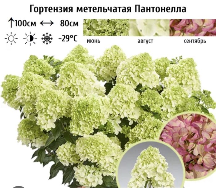 Гортензия метельчатая «Пантонелла» — эксклюзивная серия патио немецкой селекции PAN – роскошный куст с потрясающе пышными и очень крупными соцветиями. Метелки плотные, кремово-лаймового цвета, к осени плавно переходящий в нежно-розовый. Максимальная высота взрослого растения до 80 см. Крепкие и сильные побеги покрыты продолговатыми листьями ярко-зеленого цвета. Цветение раннее, продолжительное, с июня, и до заморозков.