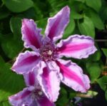 Клематис Tudor – это компактное растение. Благодаря довольно жестким, прямостоячим побегам в диаметре взрослые кусты достигают 0,8-1,2 м. Сами побеги вырастают до 2,0-2,5 м. Цветы бледно-лиловые с яркой пурпурно-красной полоской у каждого лепестка. Лепестки имеют необычные волнистые поля, которые вьются внутрь в привлекательных оборках. Цветение сорта Тюдор стартует во 2-й половине мая на прошлогодних побегах. Длится оно на протяжении 1-1,5 месяцев. В этот период все растение покрыто густым ковром из больших звездопуодобных цветов диаметром до 15 см. После короткой передышки, уже в июле, цветут побеги текущего года. Совершенно непритязательный сорт, в равной степени хорошо растет и расцветает как на солнышке, так и в затенении.